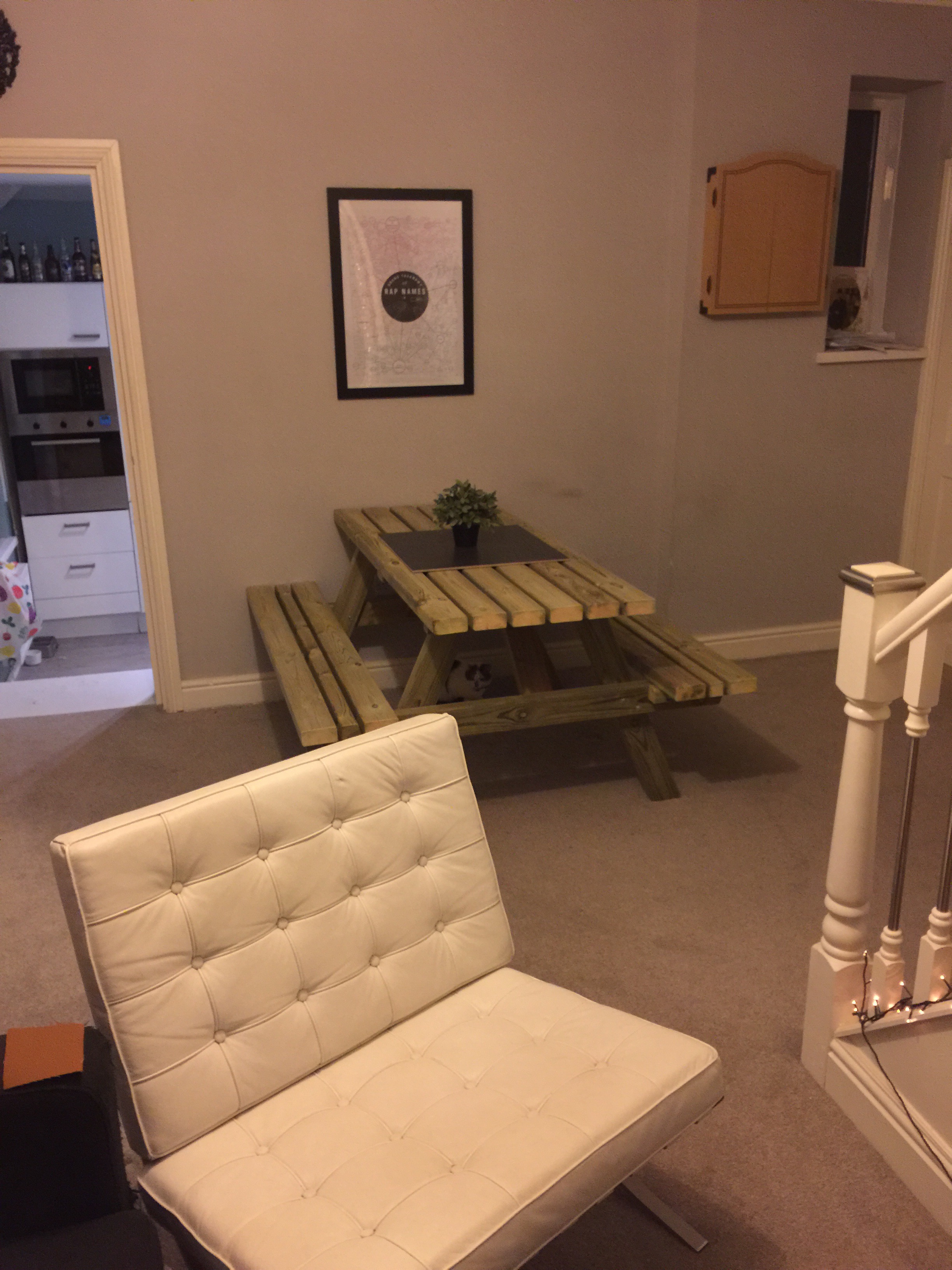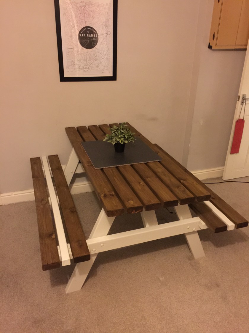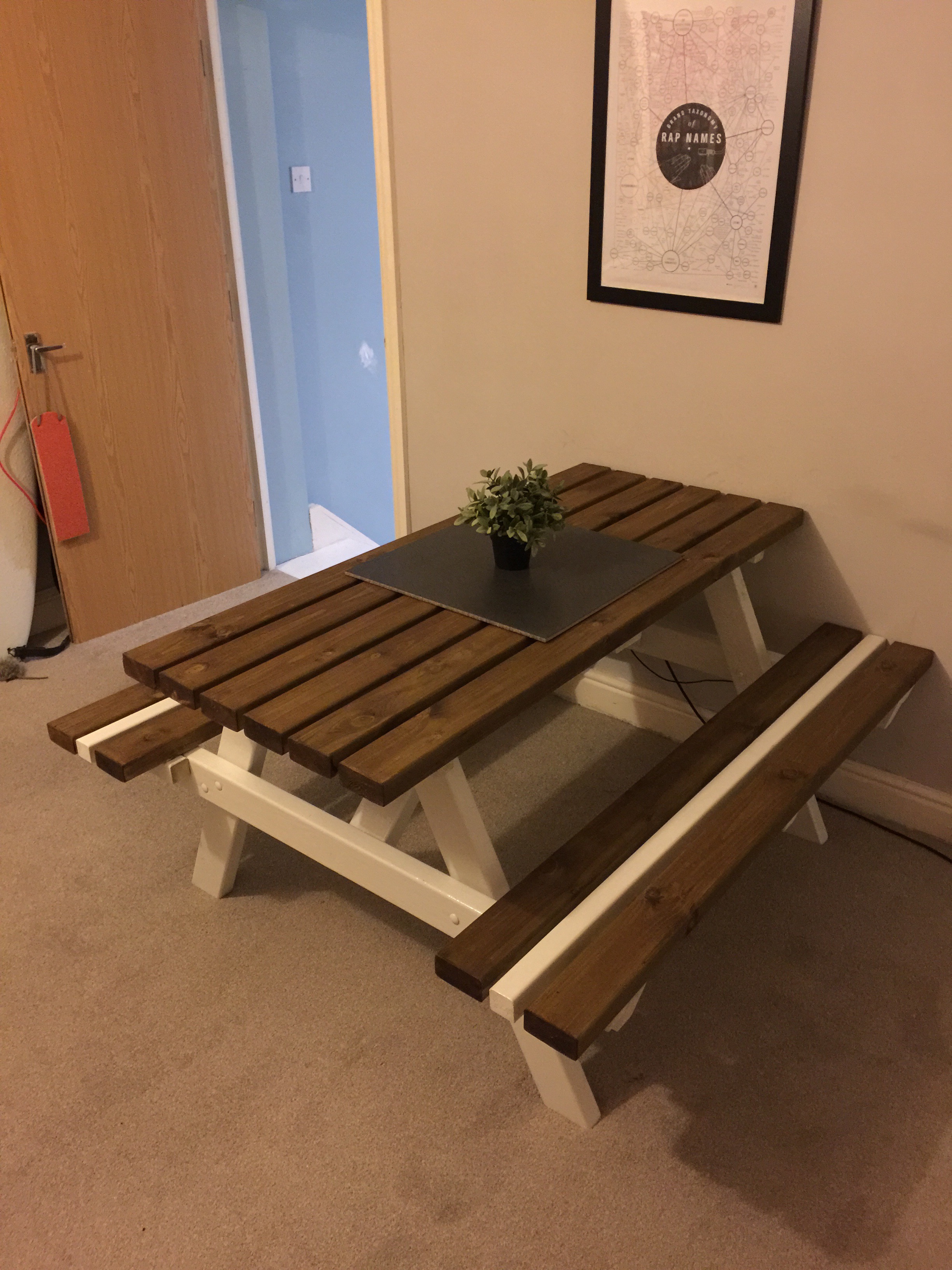 I had the idea of buying a solid wood picnic table and repurposing it as a dining table in my lounge. It was much cheaper than any other solid wood table I could find and I thought it would evoke happy memories / feelings to sit at it with friends or family.