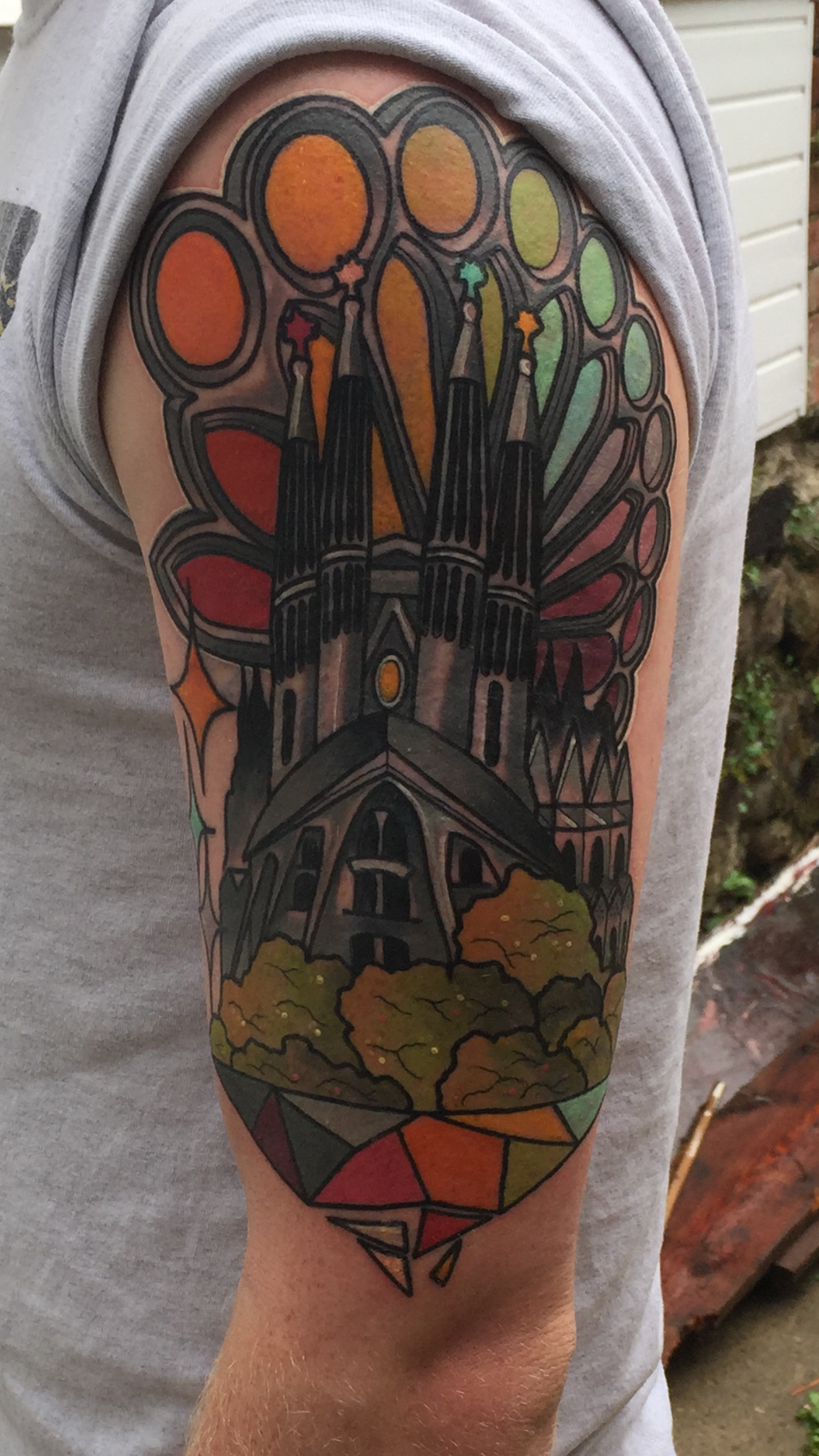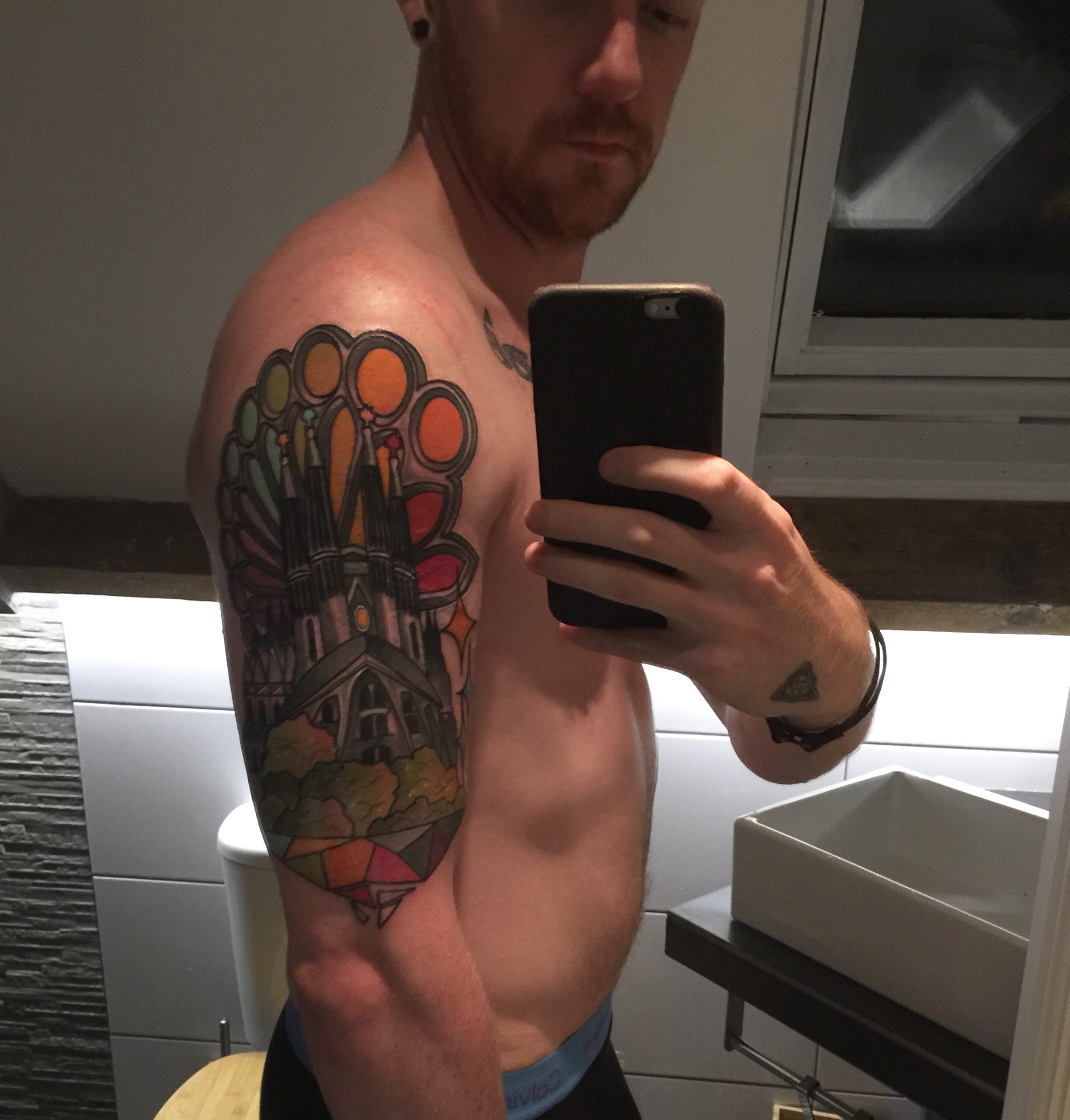 After 12 years of having a crappy tribal tattoo on my arm I spent a year getting it lasered then commissioned Mike Gibson from Leeds to design me a tattoo of my favourite building – Sagrada Familia in Barcelona.