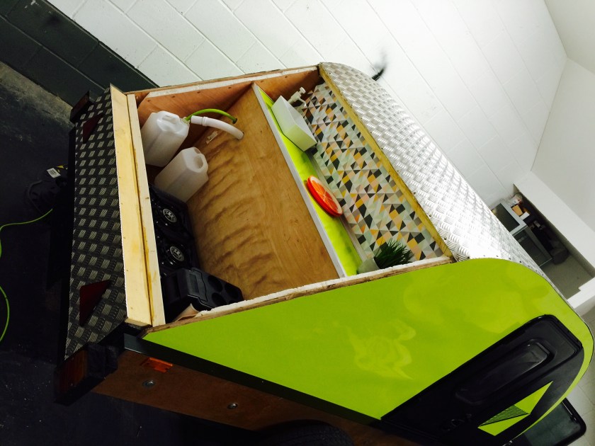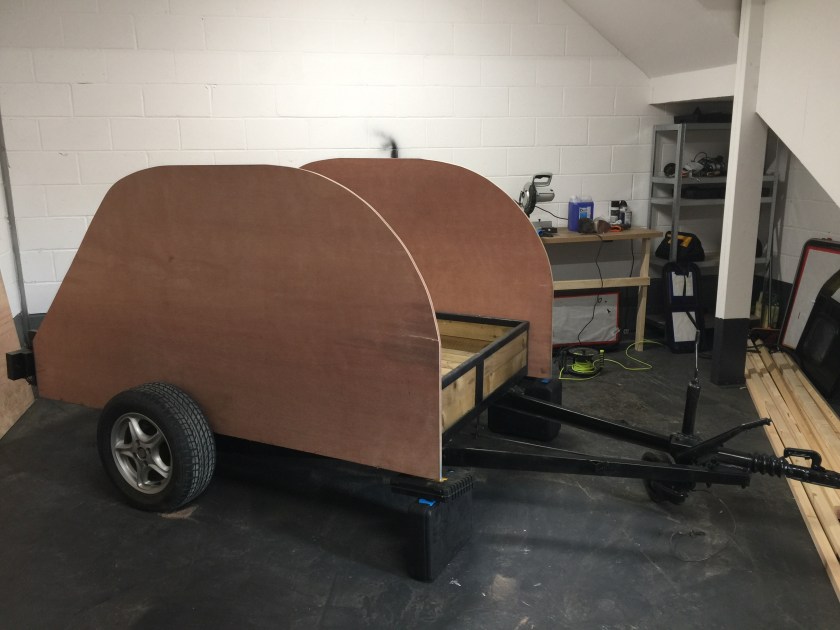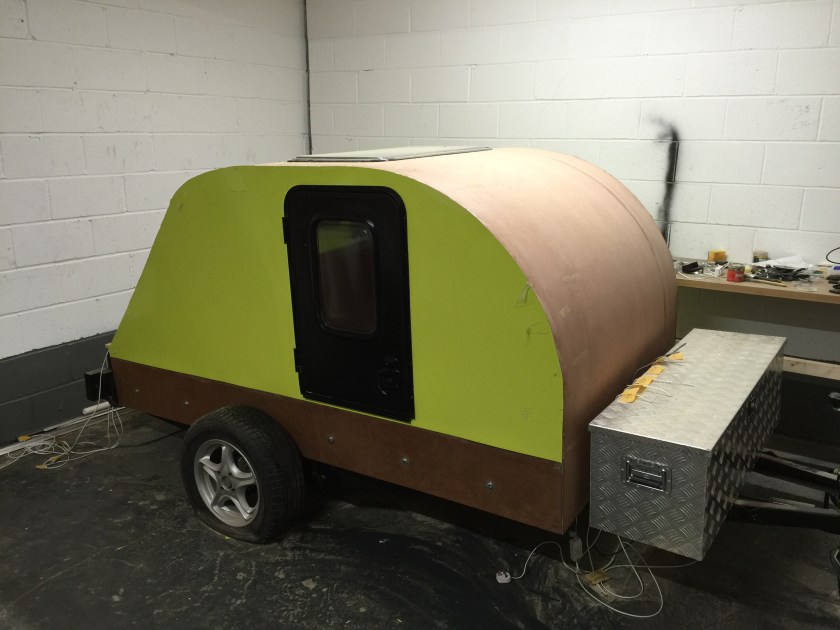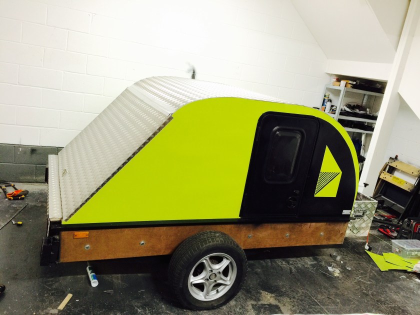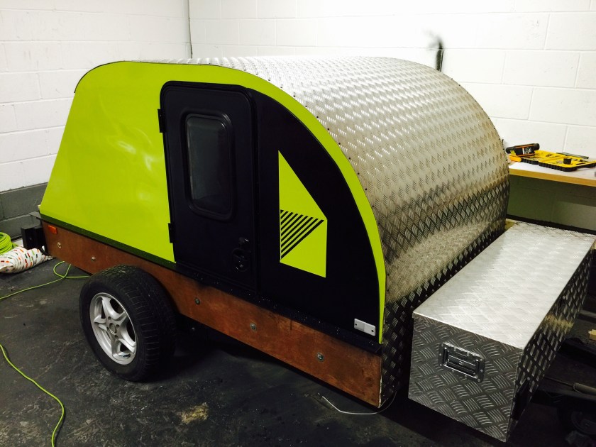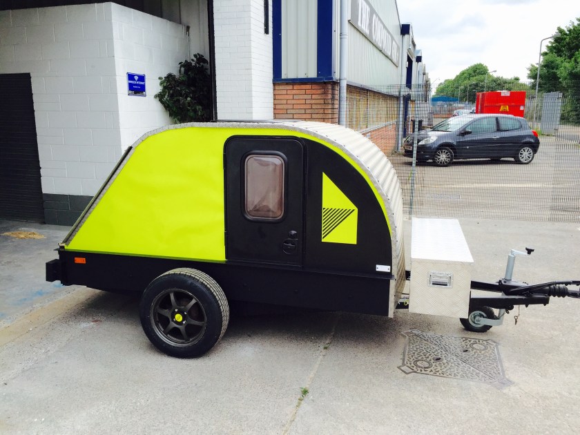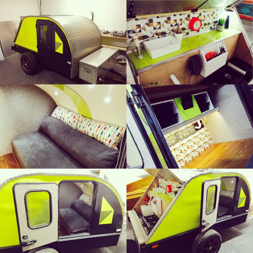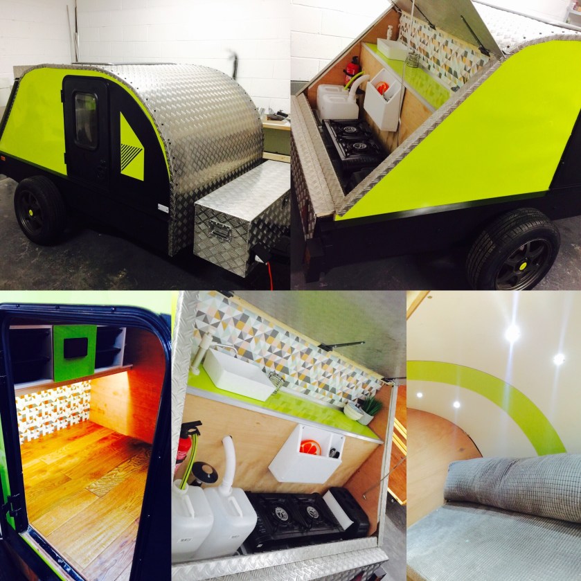 I bought a standard flat-bed trailer and converted it into a teardrop trailer with mains electric, LED lighting, USB ports, a fridge, working tap and sink, gas hob, HD TV/DVD player that can mirror my iPhone screen, solid oak flooring, battery power, roof window and sofa bed.