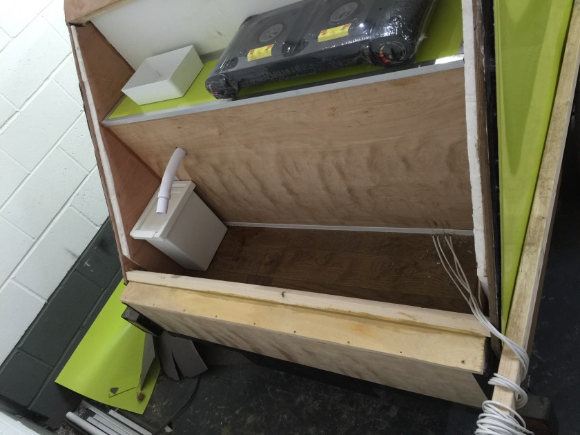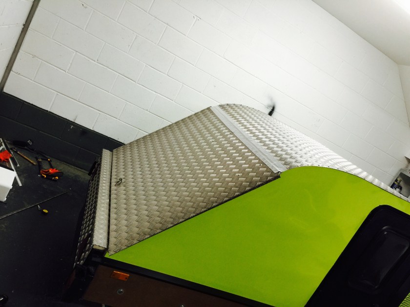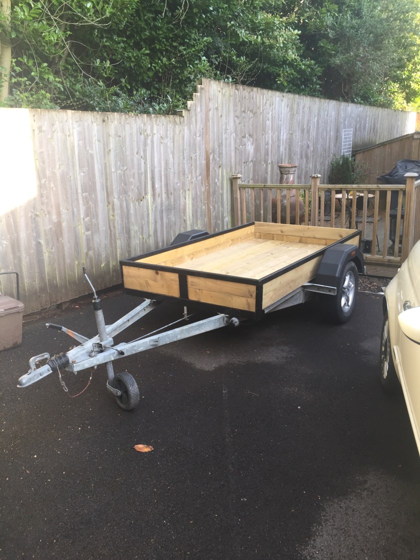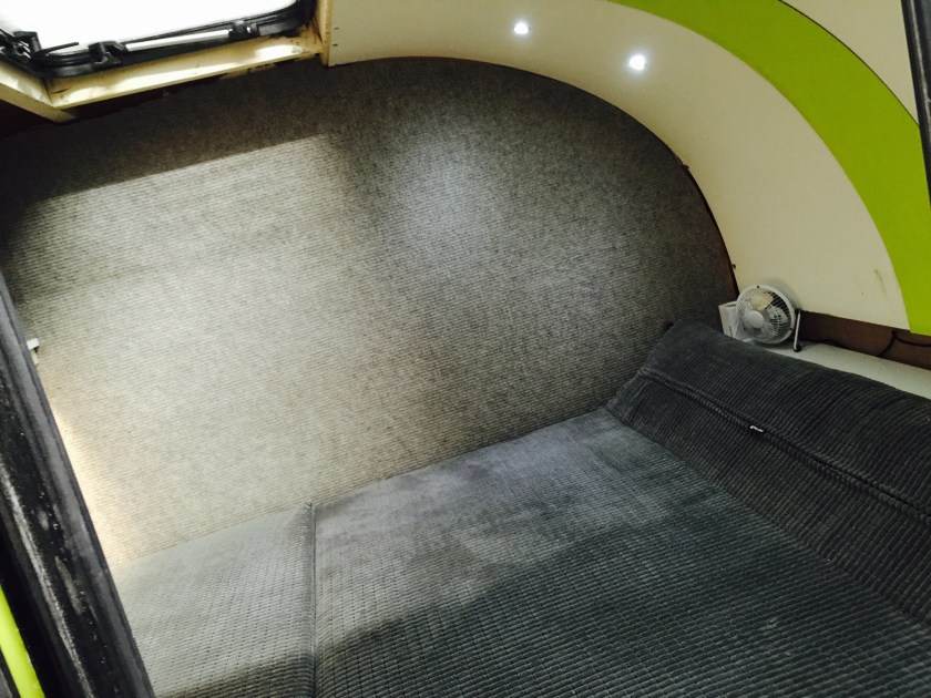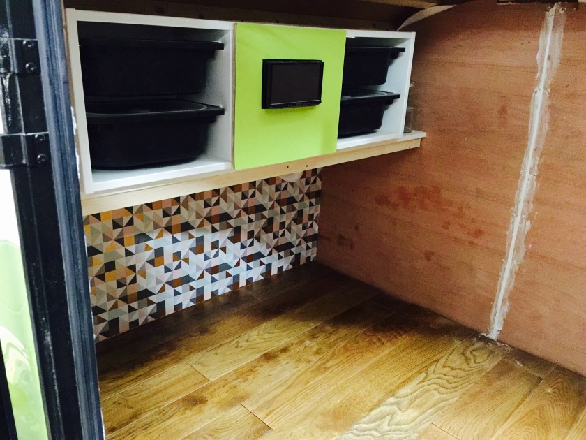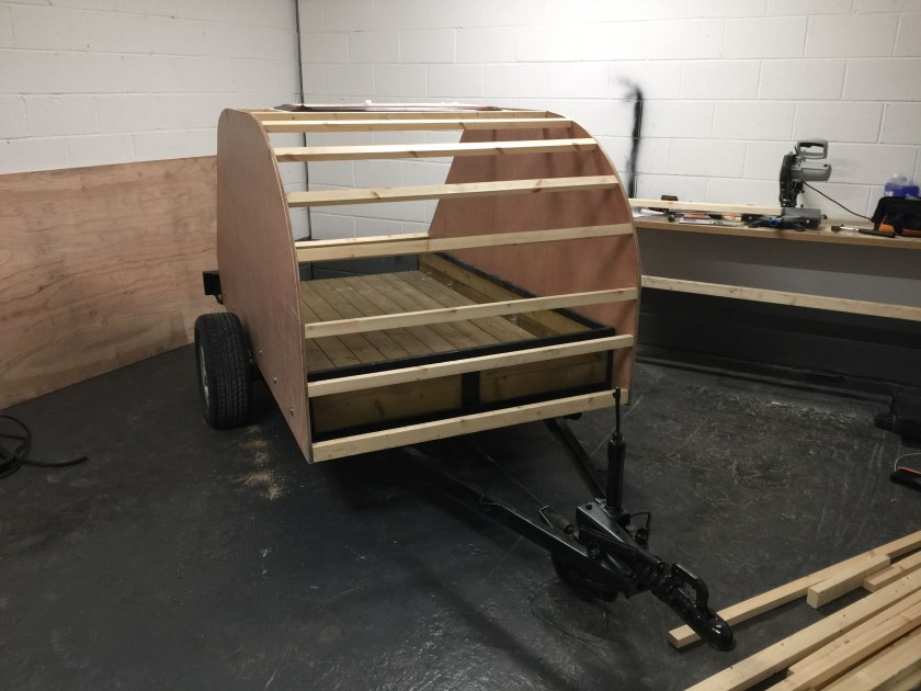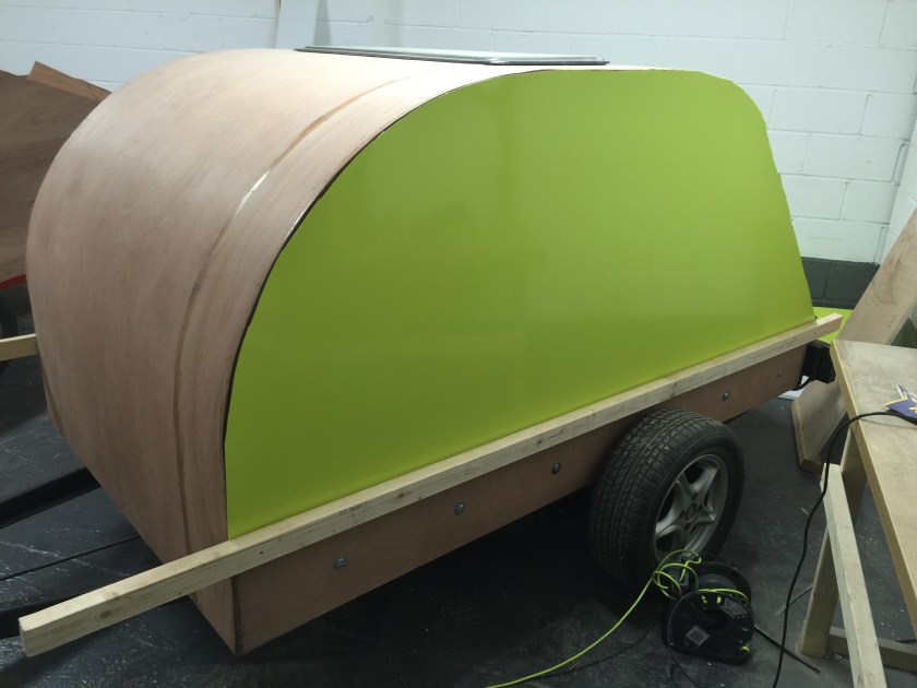 I bought a standard flat-bed trailer and converted it into a teardrop trailer with mains electric, LED lighting, USB ports, a fridge, working tap and sink, gas hob, HD TV/DVD player that can mirror my iPhone screen, solid oak flooring, battery power, roof window and sofa bed.