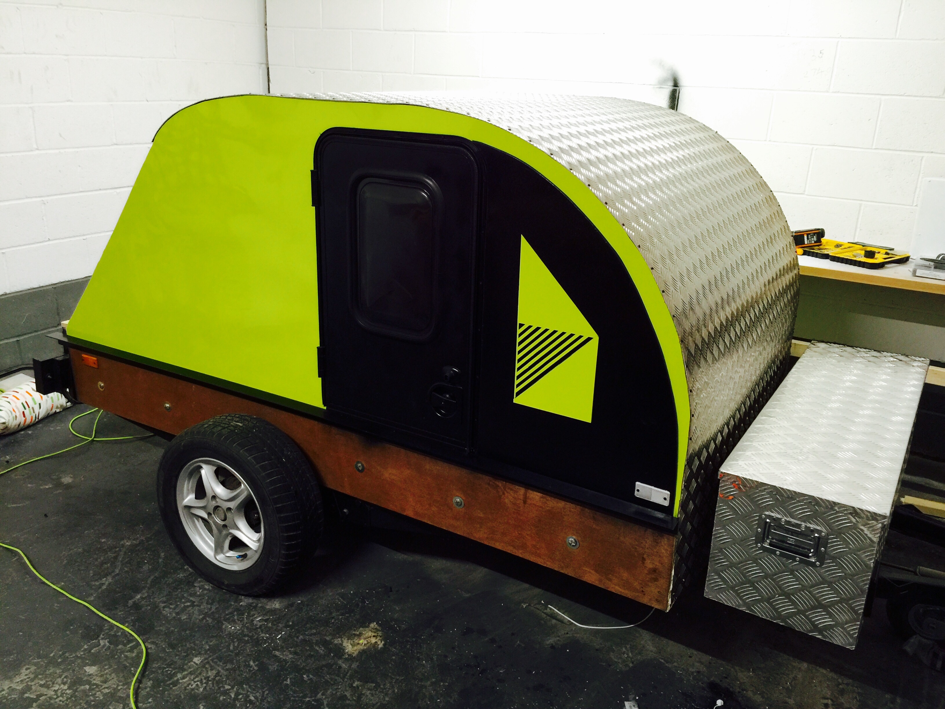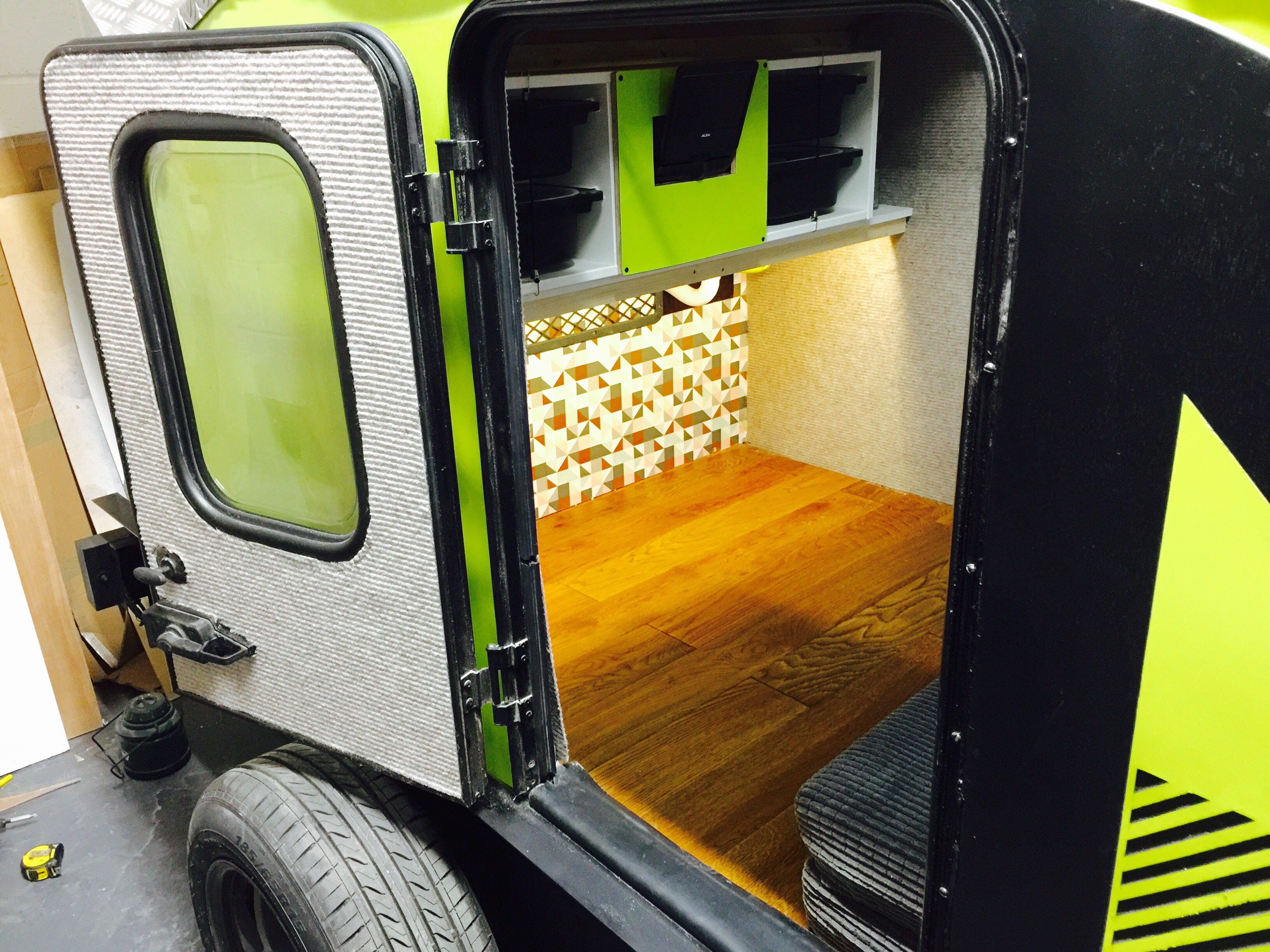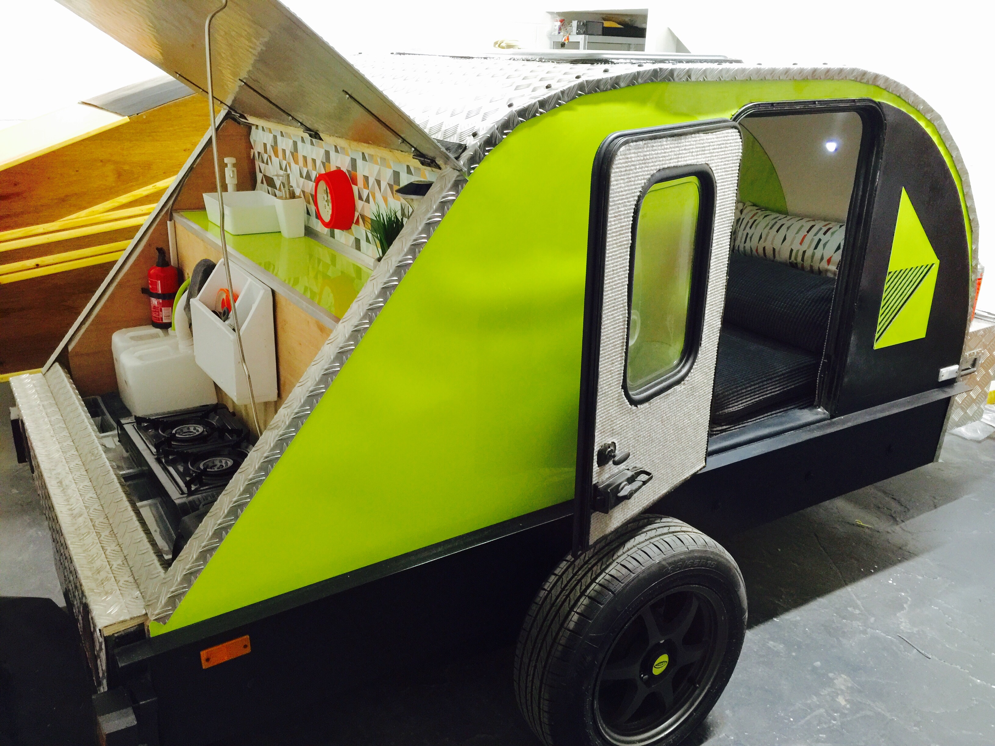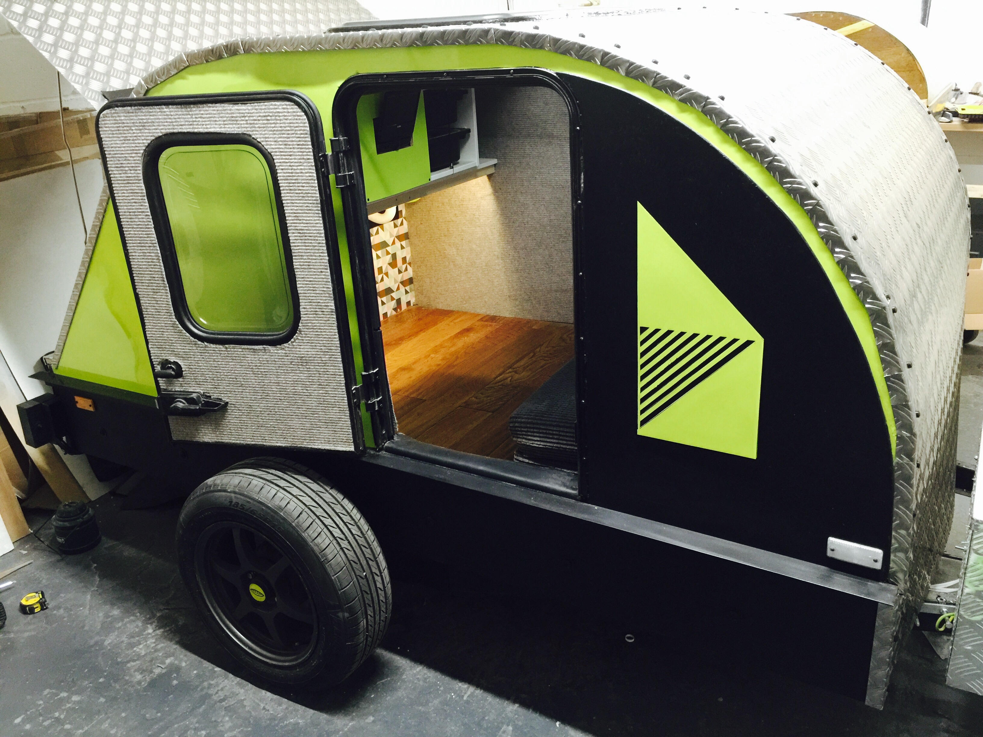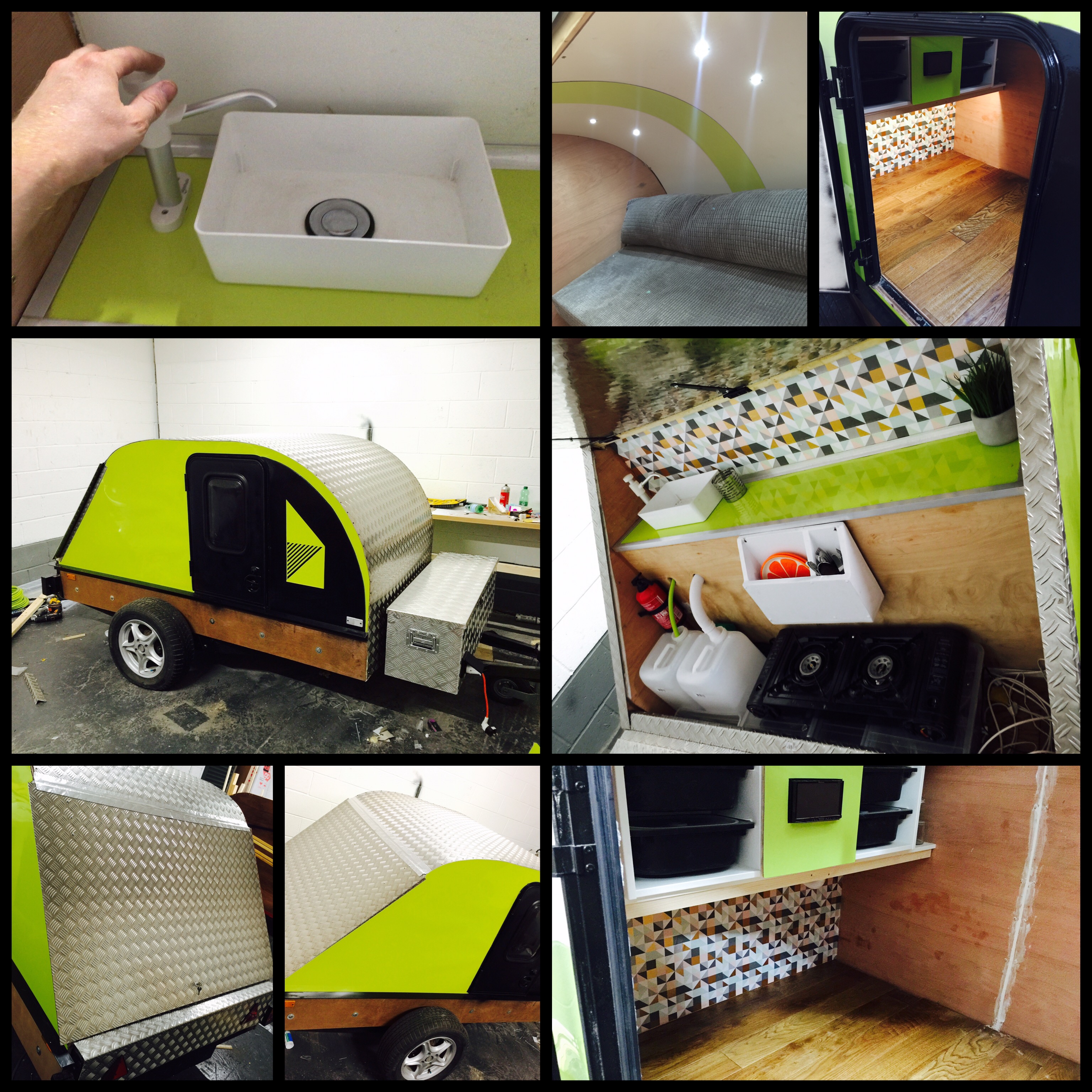 I bought a standard flat-bed trailer and converted it into a teardrop trailer with mains electric, LED lighting, USB ports, a fridge, working tap and sink, gas hob, HD TV/DVD player that can mirror my iPhone screen, solid oak flooring, battery power, roof window and sofa bed.