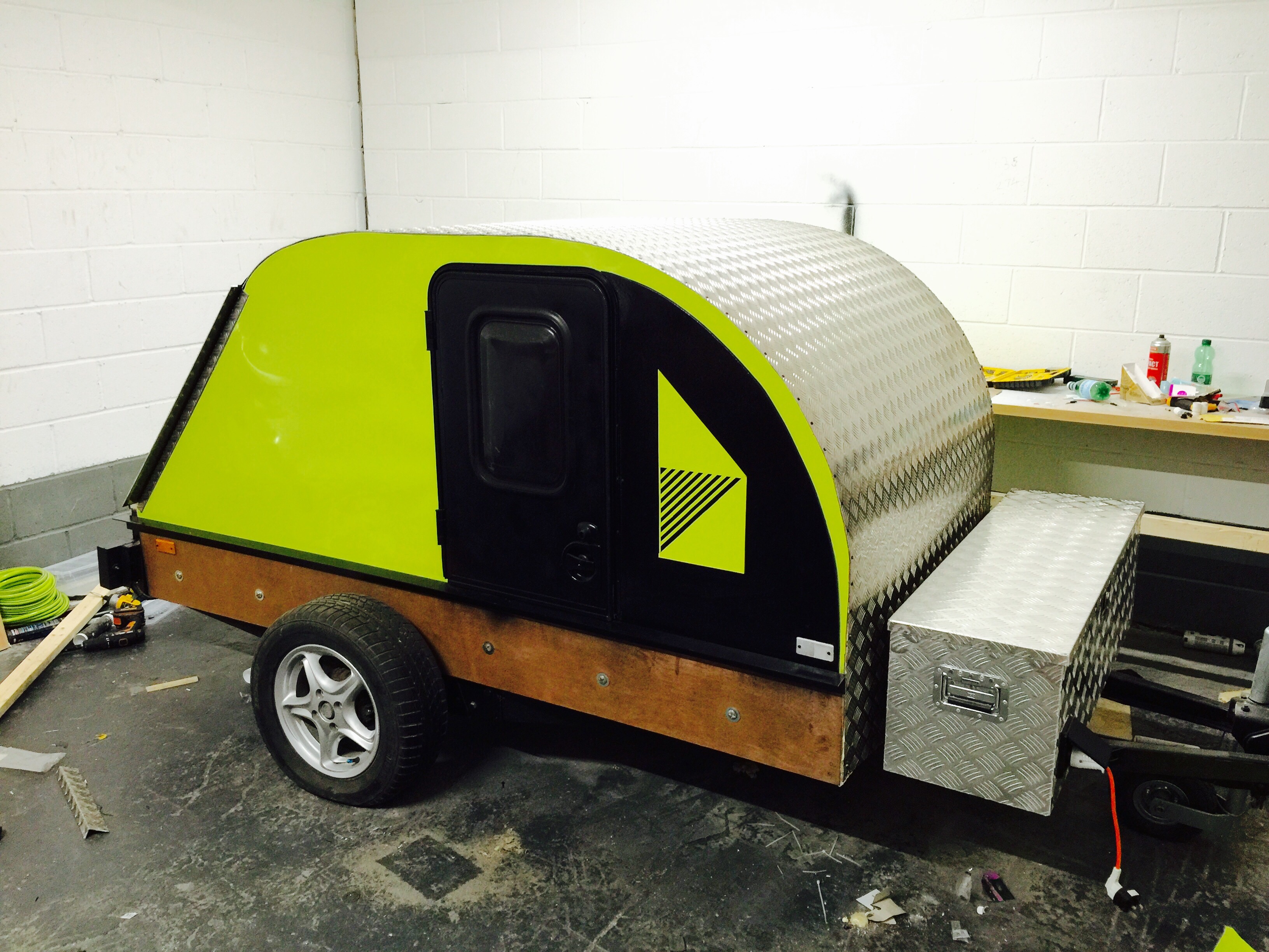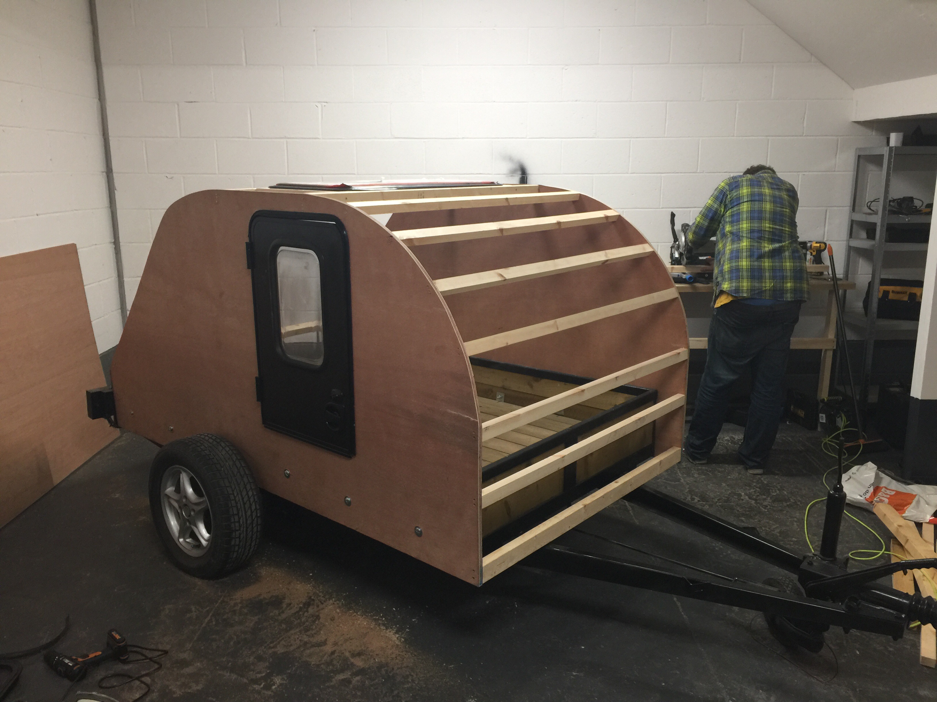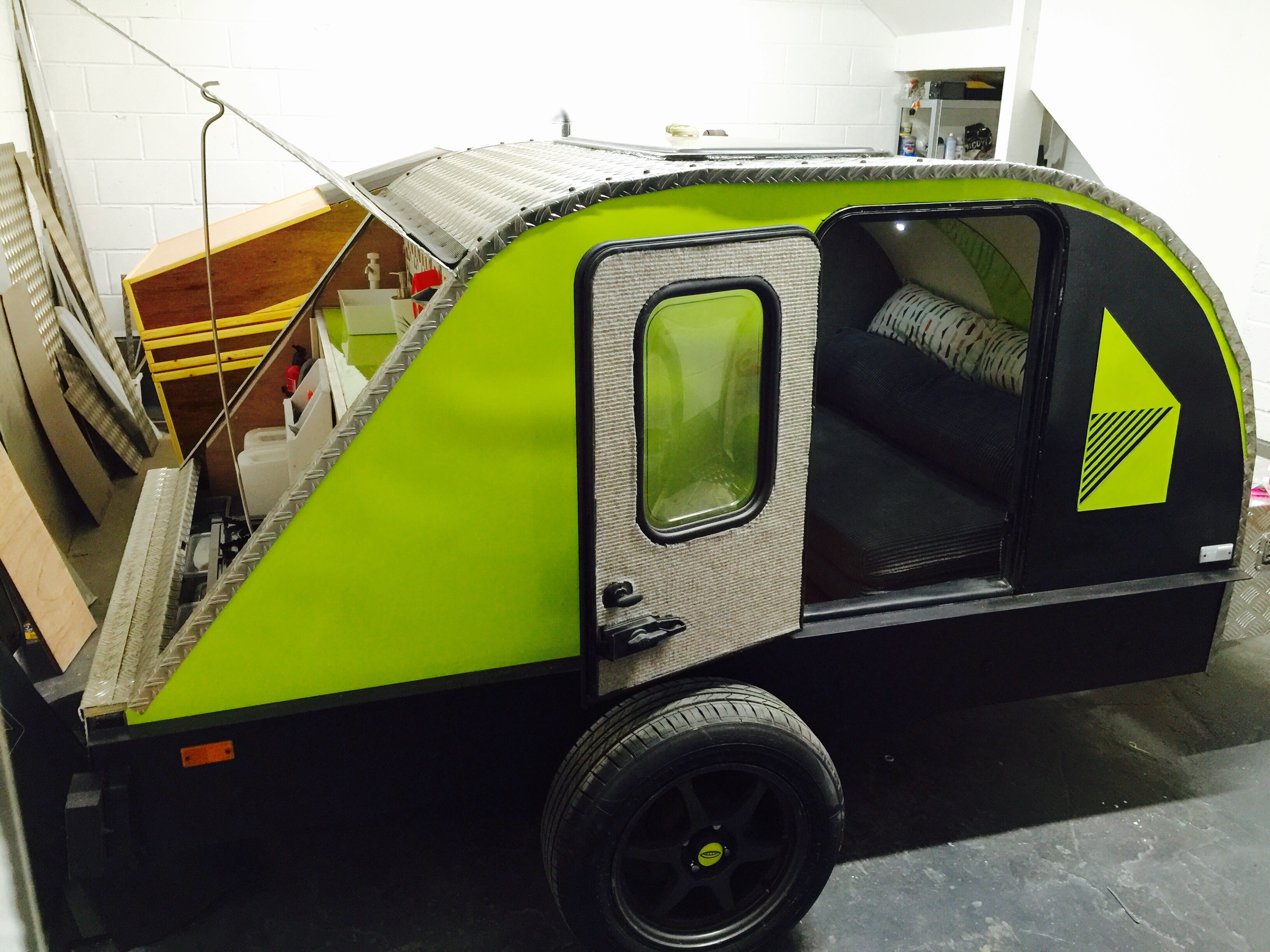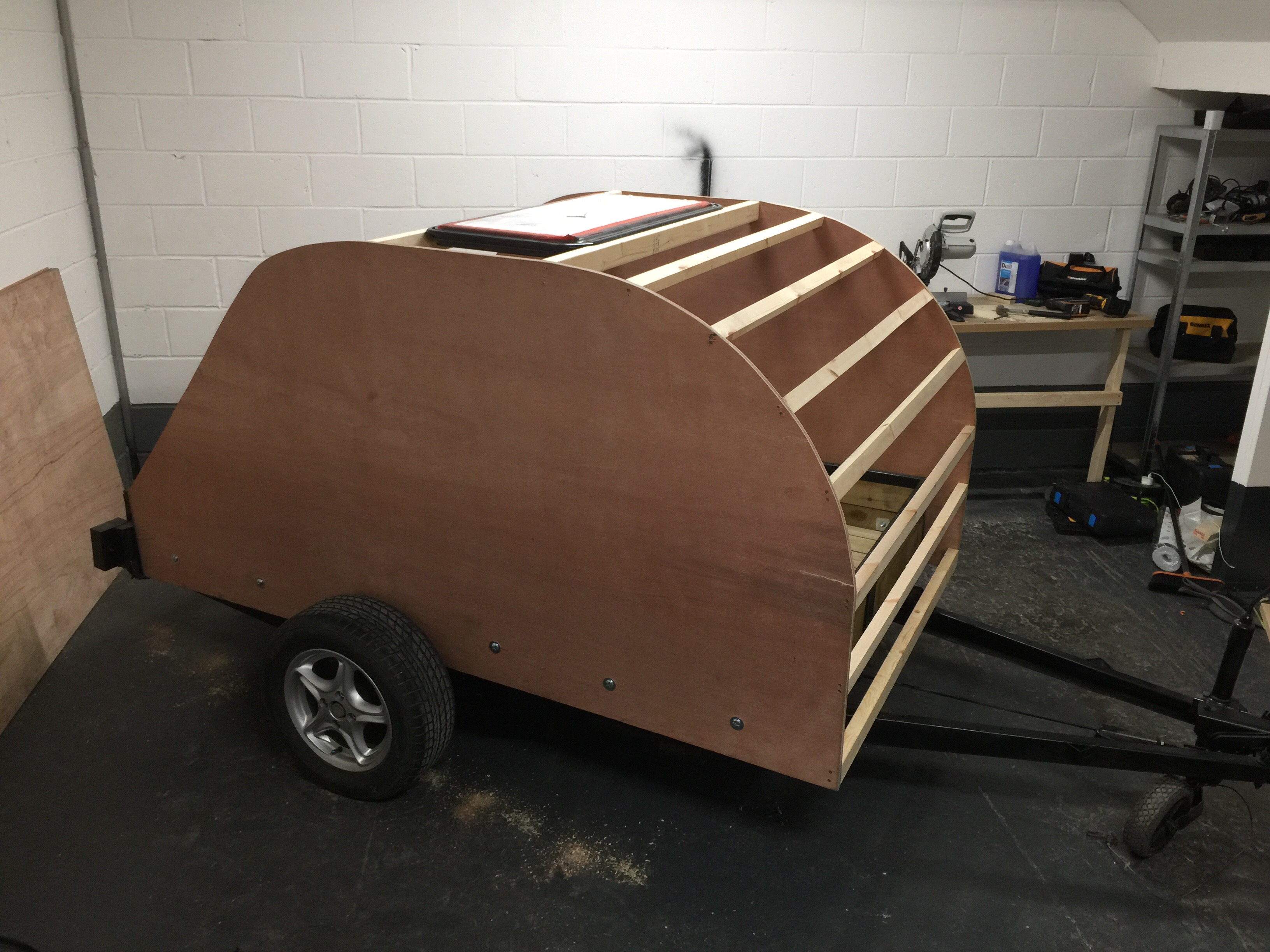 I bought a standard flat-bed trailer and converted it into a teardrop trailer with mains electric, LED lighting, USB ports, a fridge, working tap and sink, gas hob, HD TV/DVD player that can mirror my iPhone screen, solid oak flooring, battery power, roof window and sofa bed.