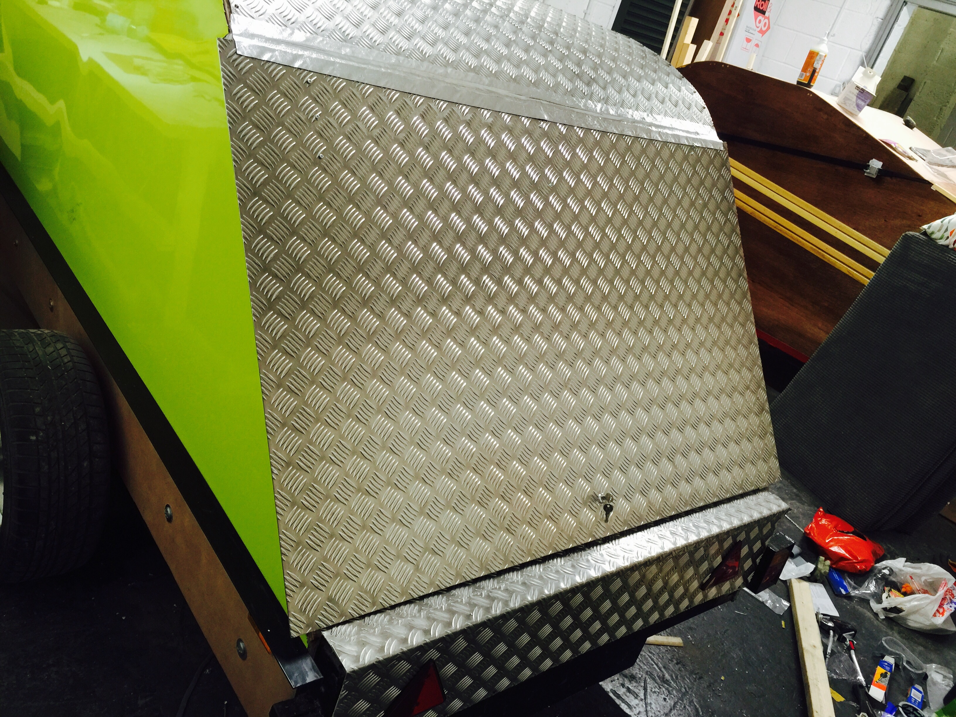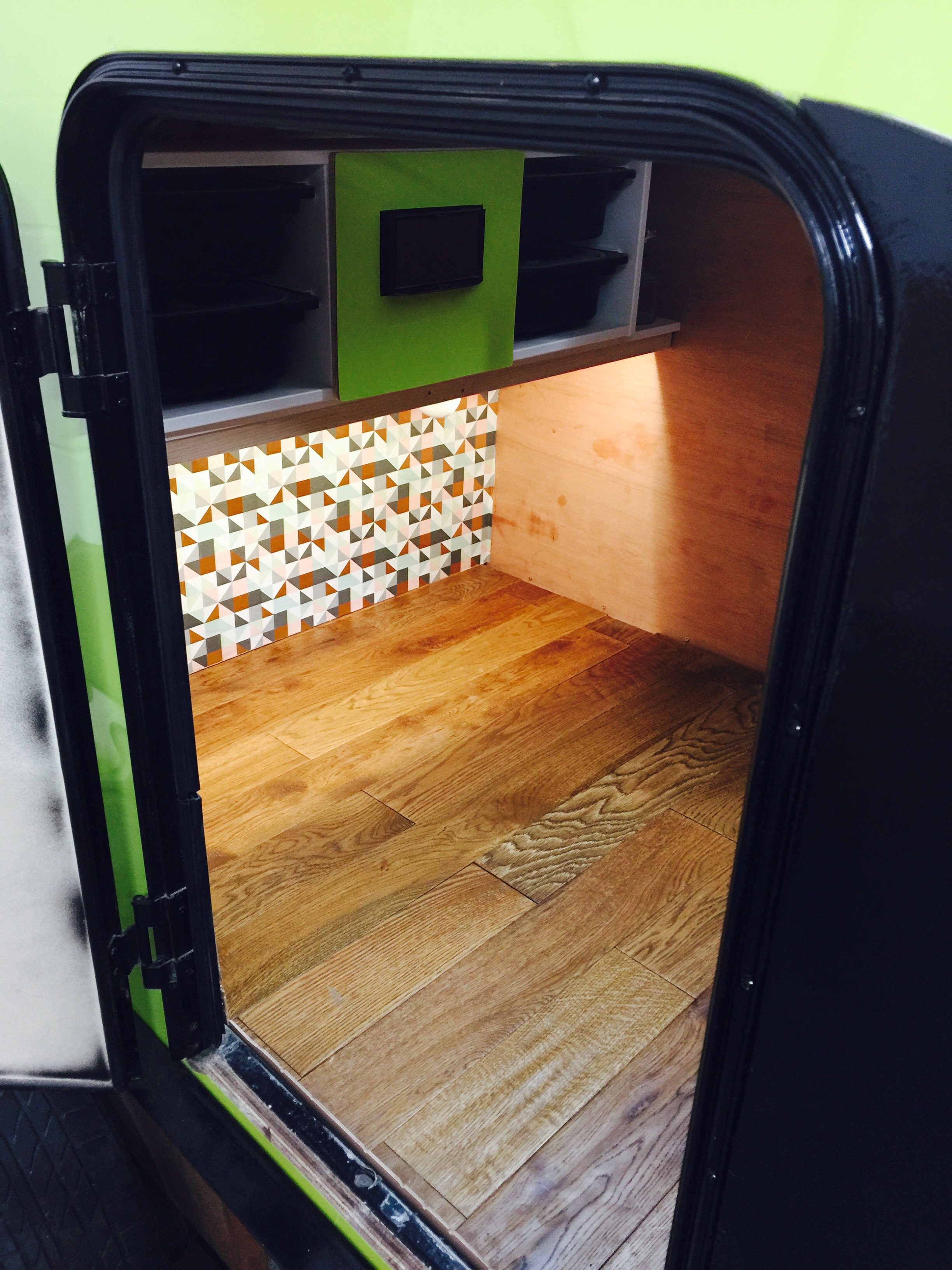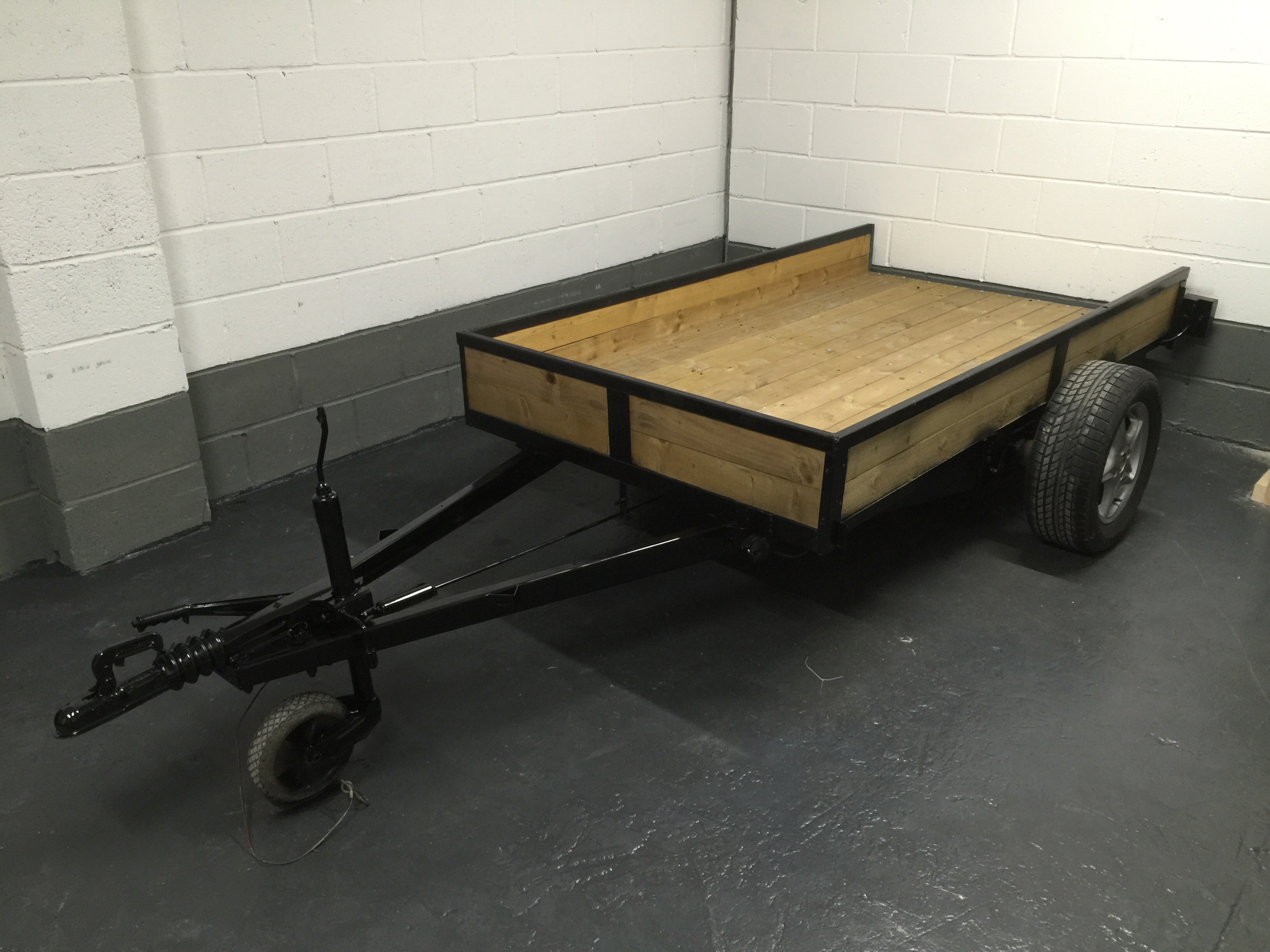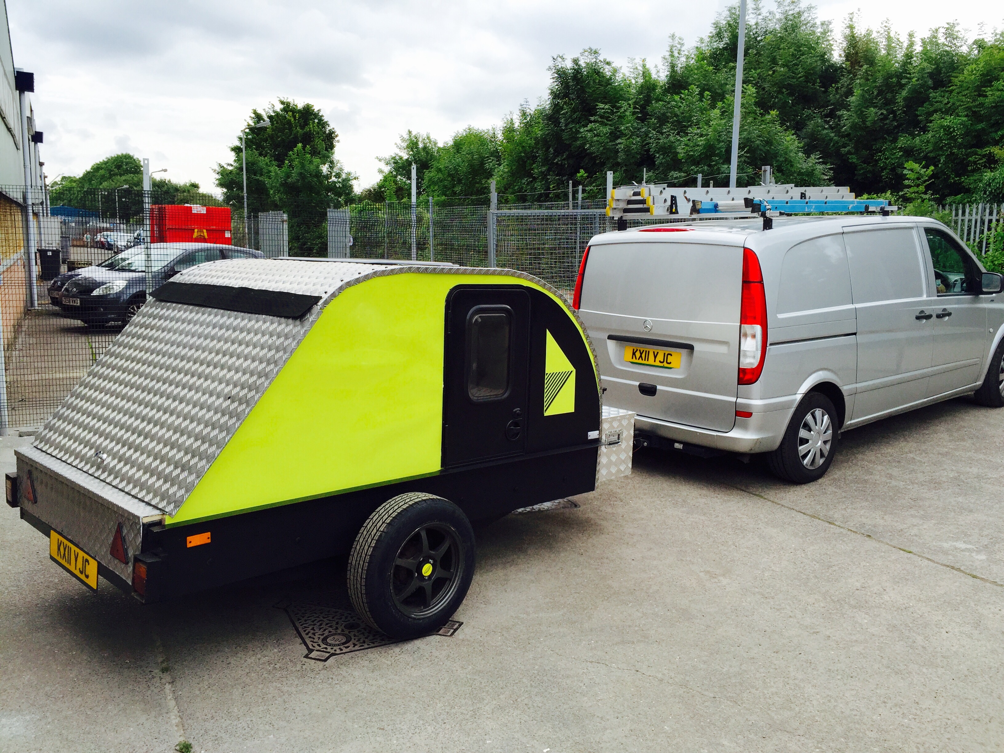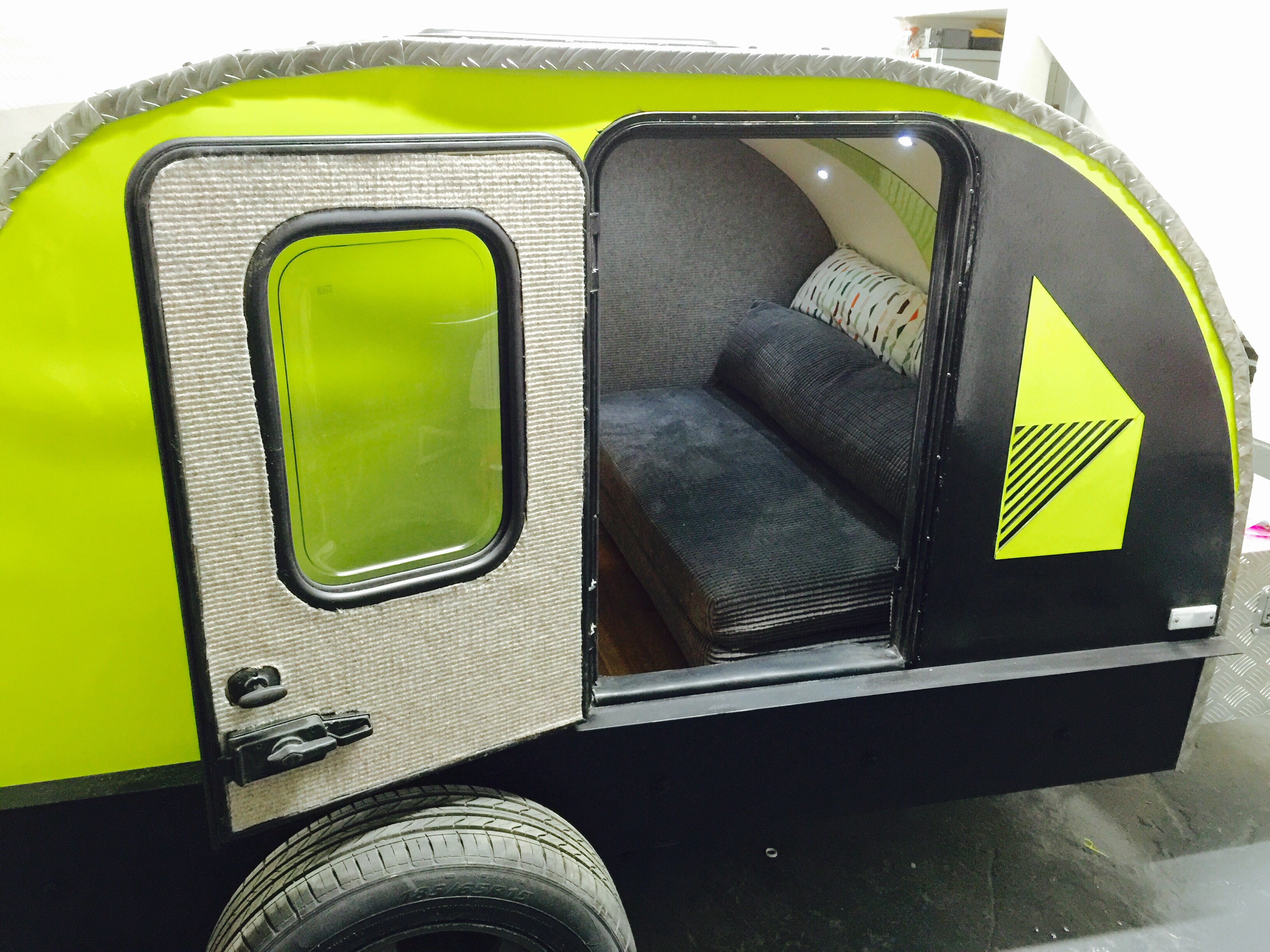 I bought a standard flat-bed trailer and converted it into a teardrop trailer with mains electric, LED lighting, USB ports, a fridge, working tap and sink, gas hob, HD TV/DVD player that can mirror my iPhone screen, solid oak flooring, battery power, roof window and sofa bed.