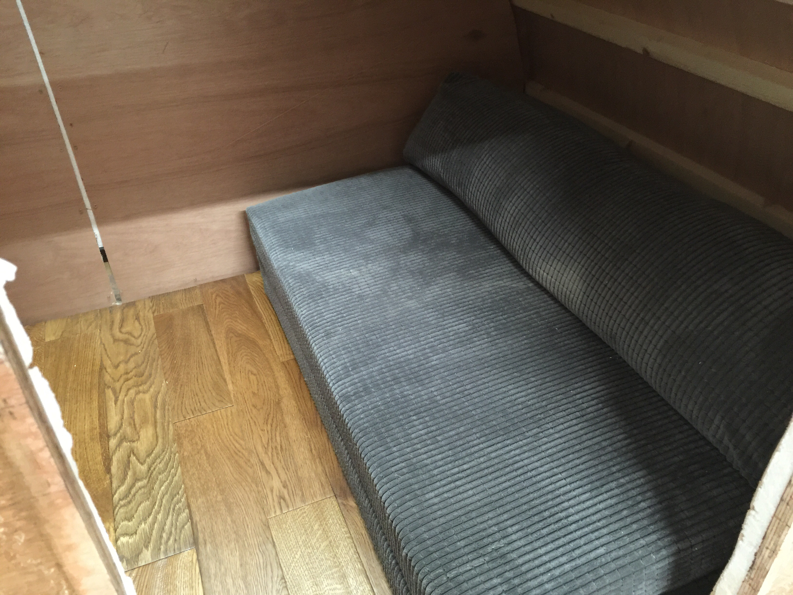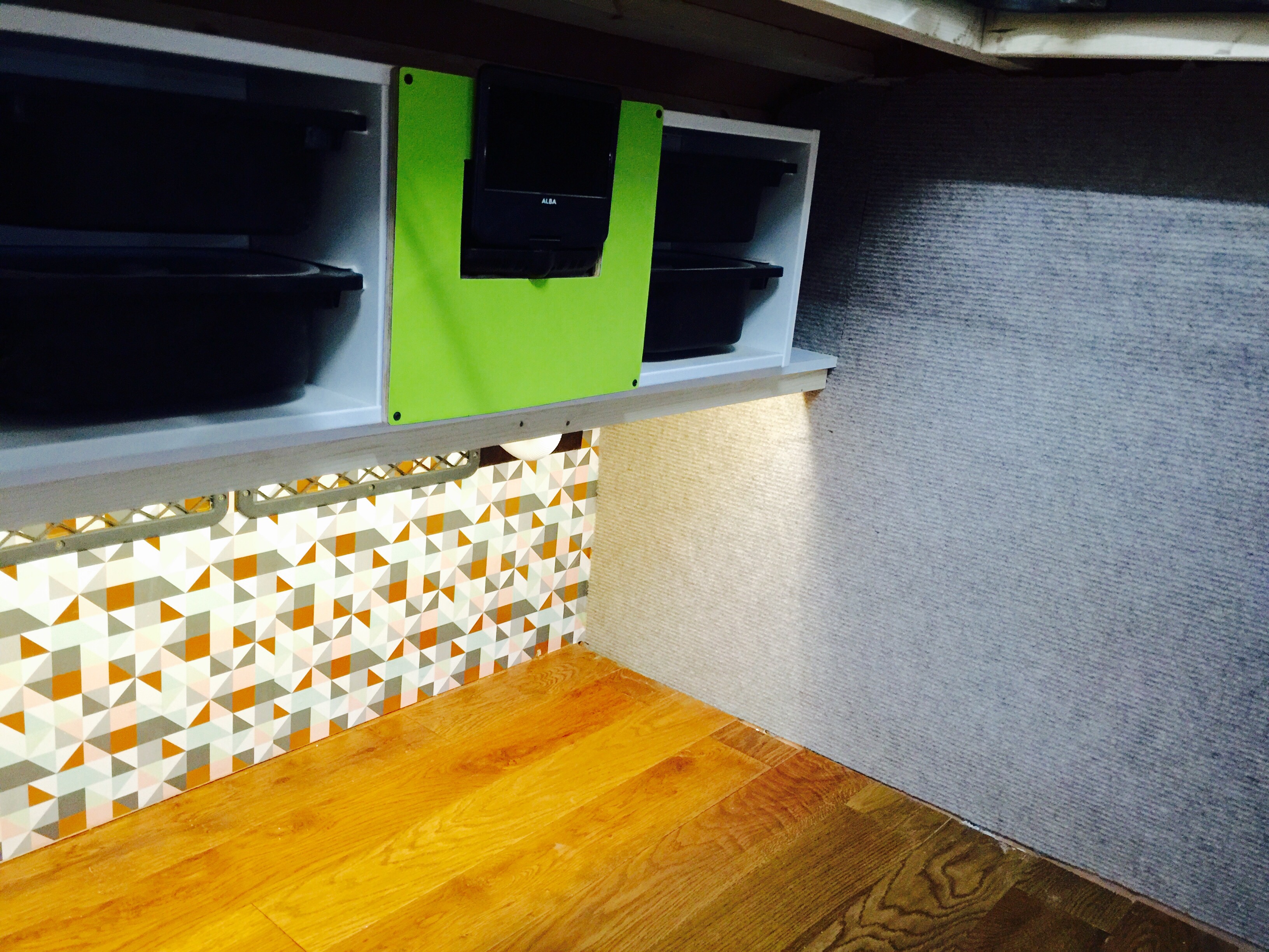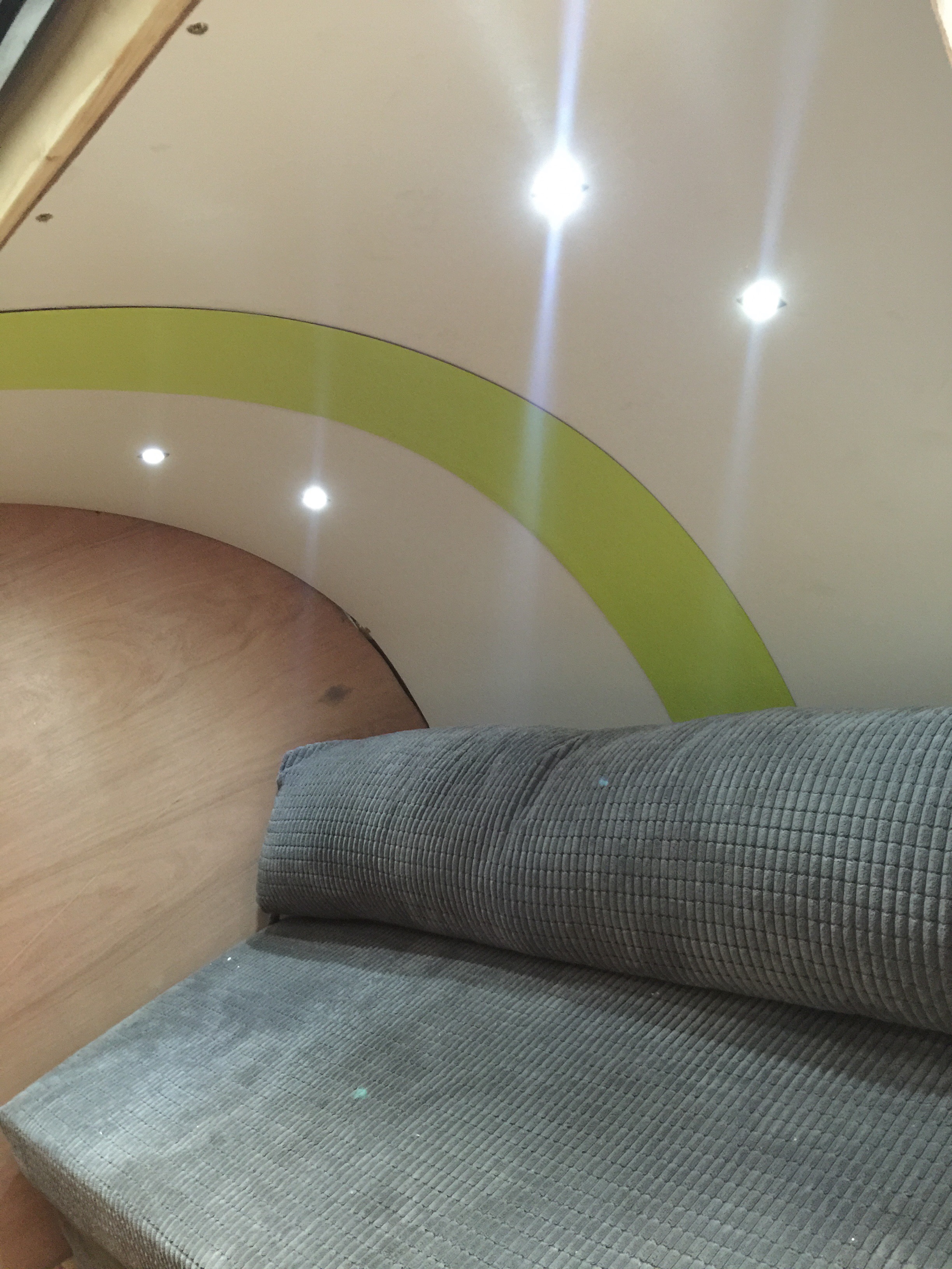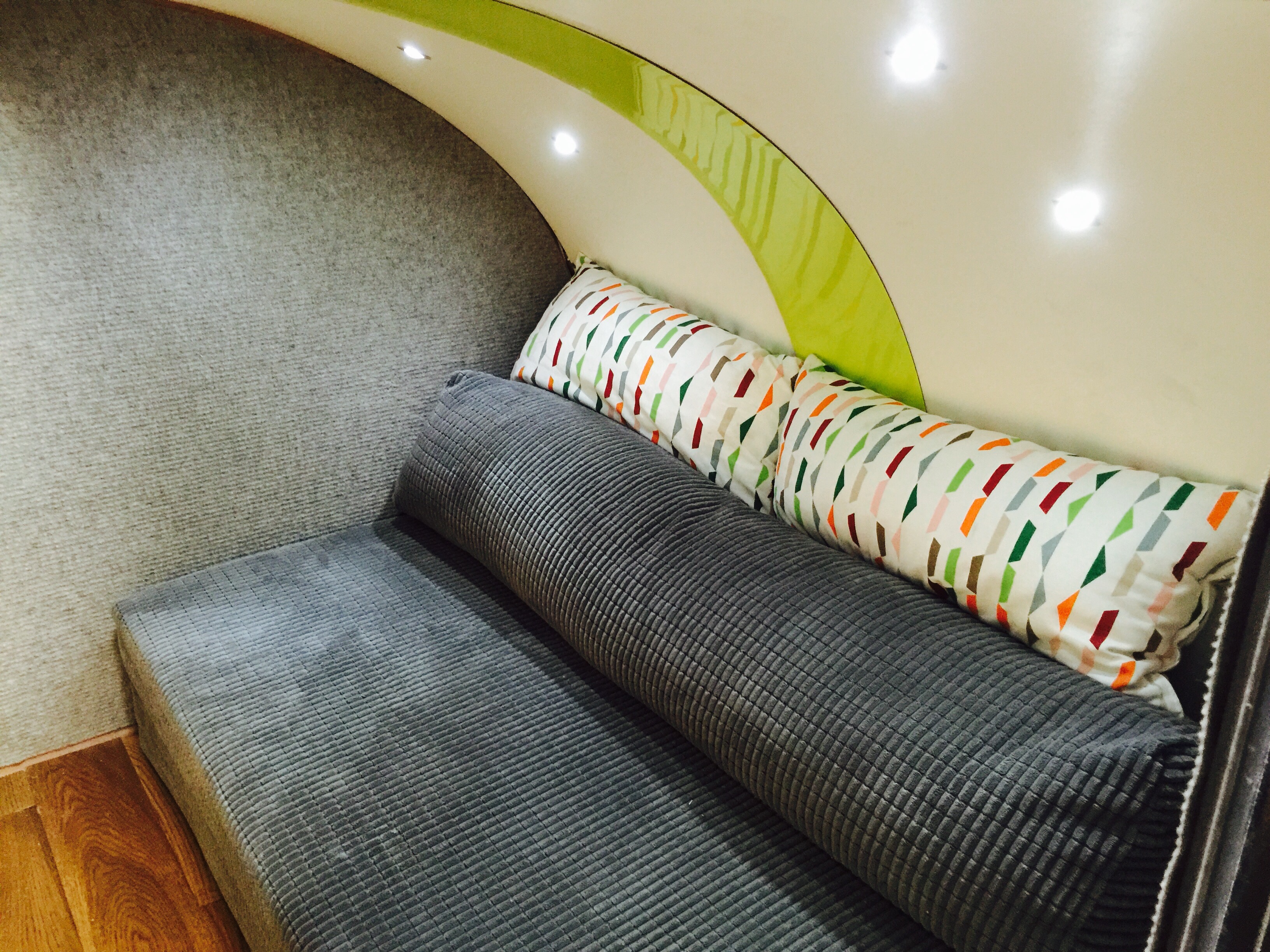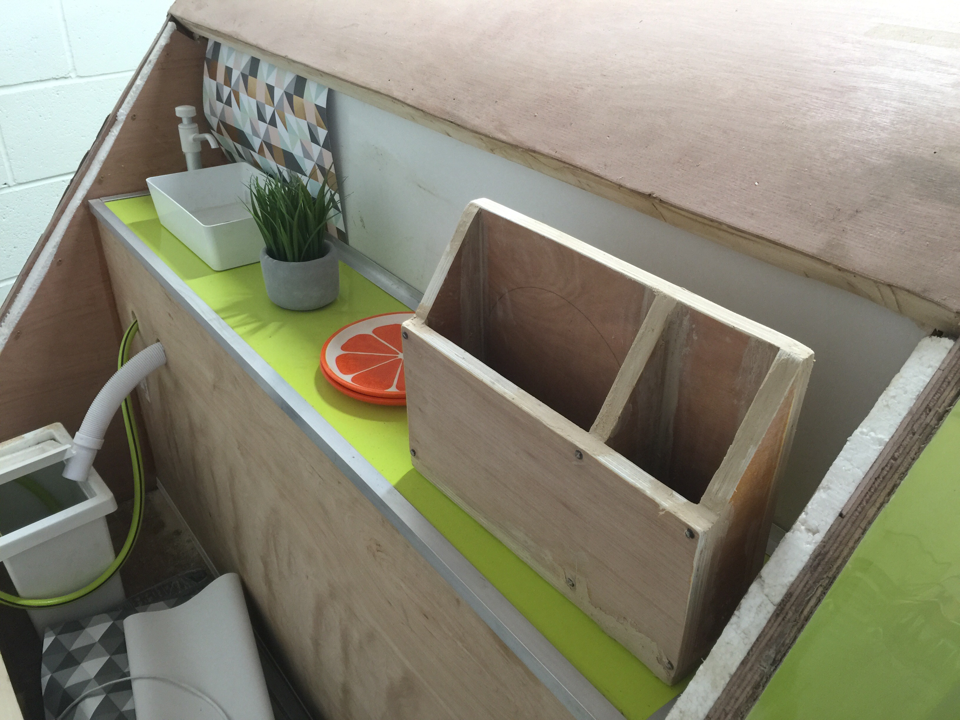 I bought a standard flat-bed trailer and converted it into a teardrop trailer with mains electric, LED lighting, USB ports, a fridge, working tap and sink, gas hob, HD TV/DVD player that can mirror my iPhone screen, solid oak flooring, battery power, roof window and sofa bed.